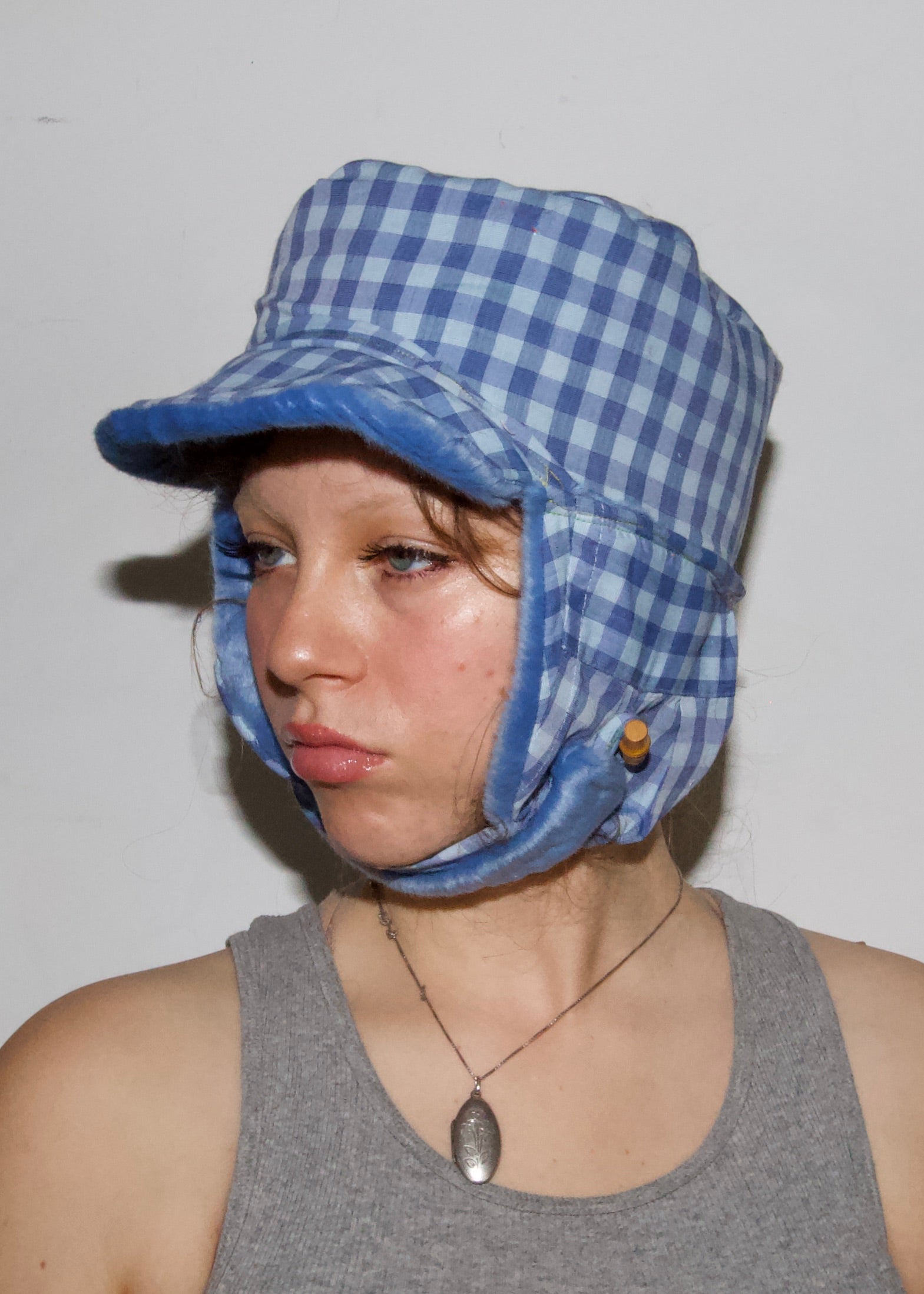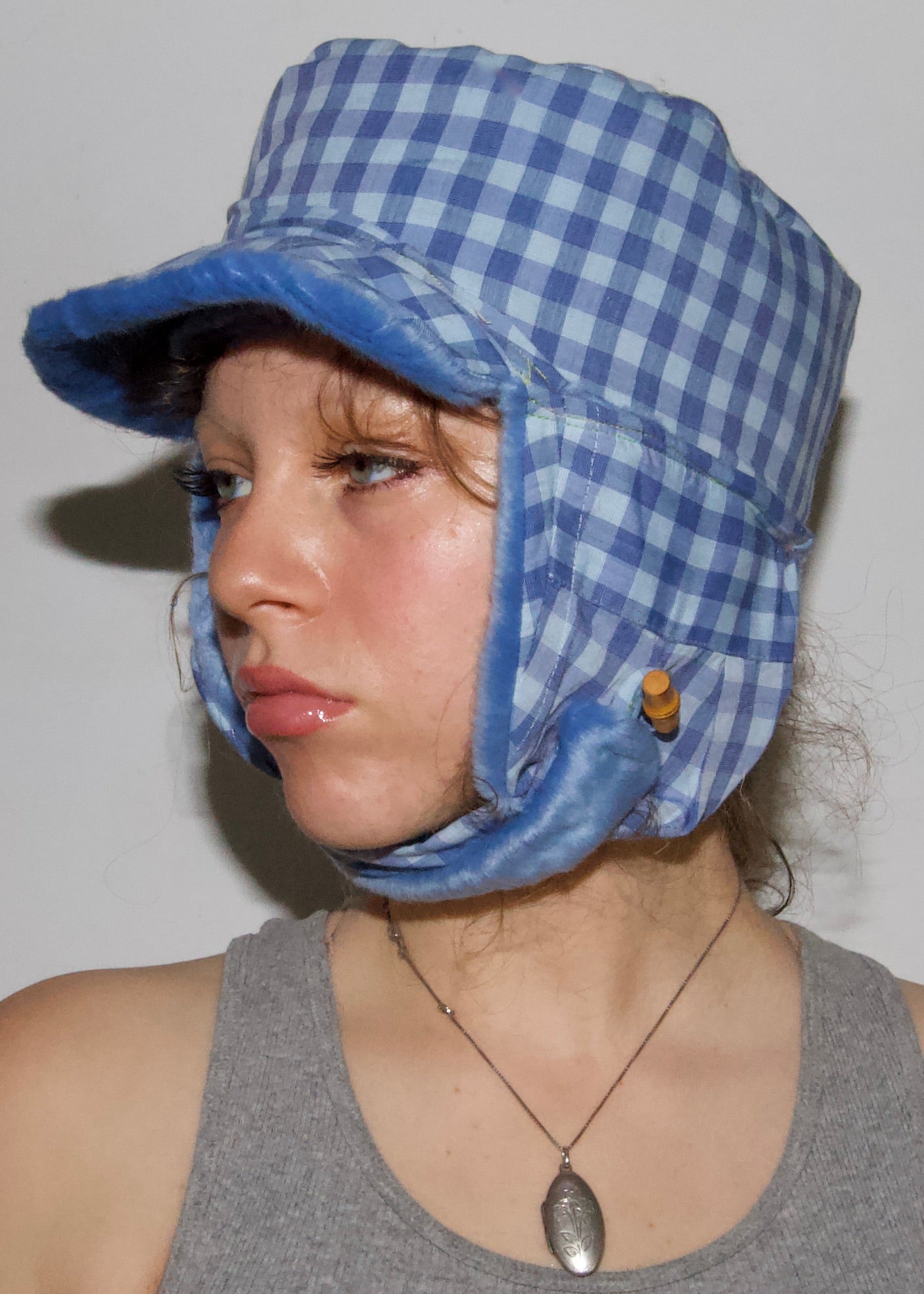 This faux fur lined gingham maskie-trapper-hat was made from a pre-loved button up shirt, a pre-loved jumper (inside top) and leftover scraps sourced from the remnants of my friend’s gift to her lover in 2016. She made him a scarf. And though their relationship didn’t last, the warmth it generated still permeates today, keeping the wearer of this maskie warm and perhaps, even her ex lover’s neck.