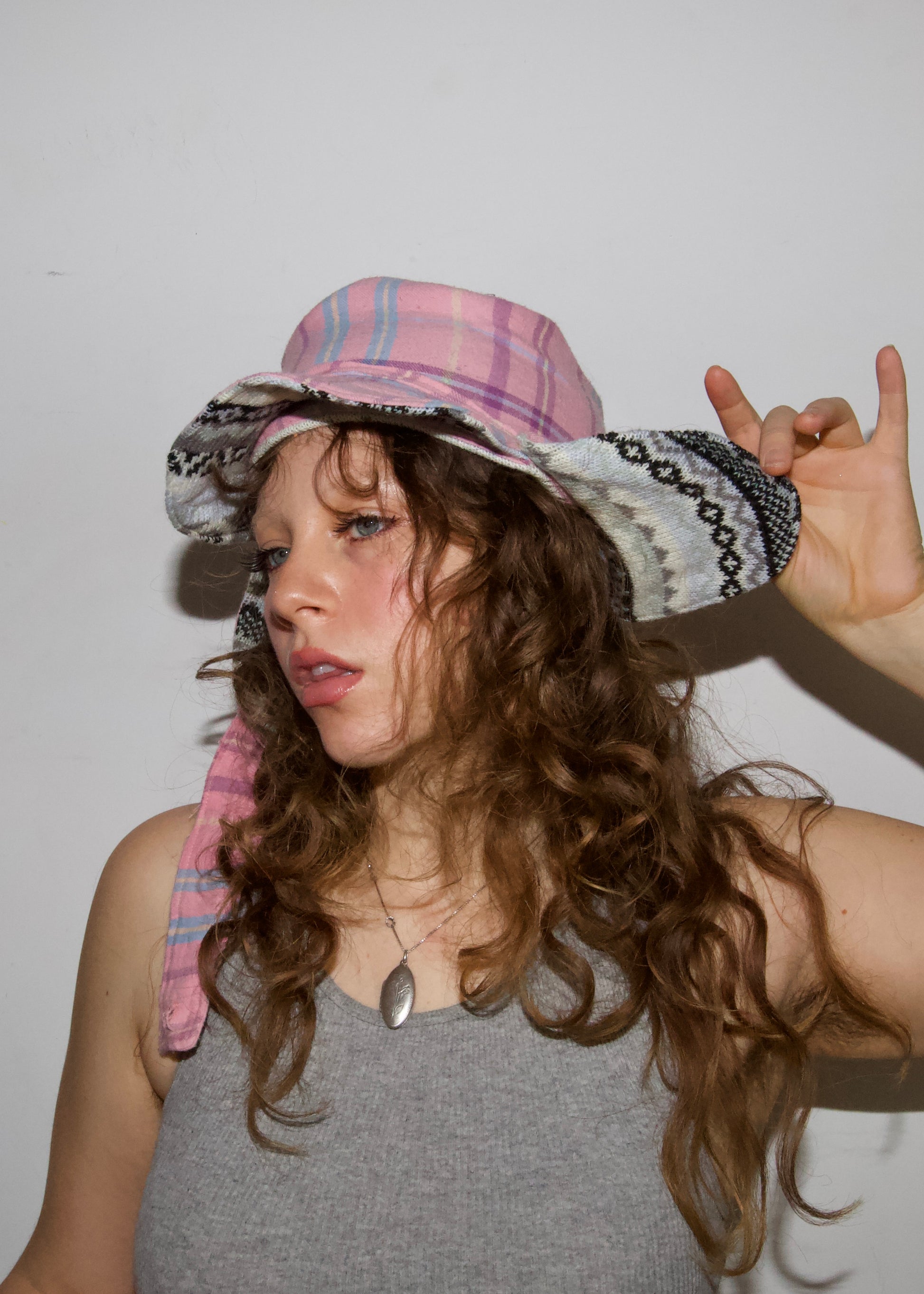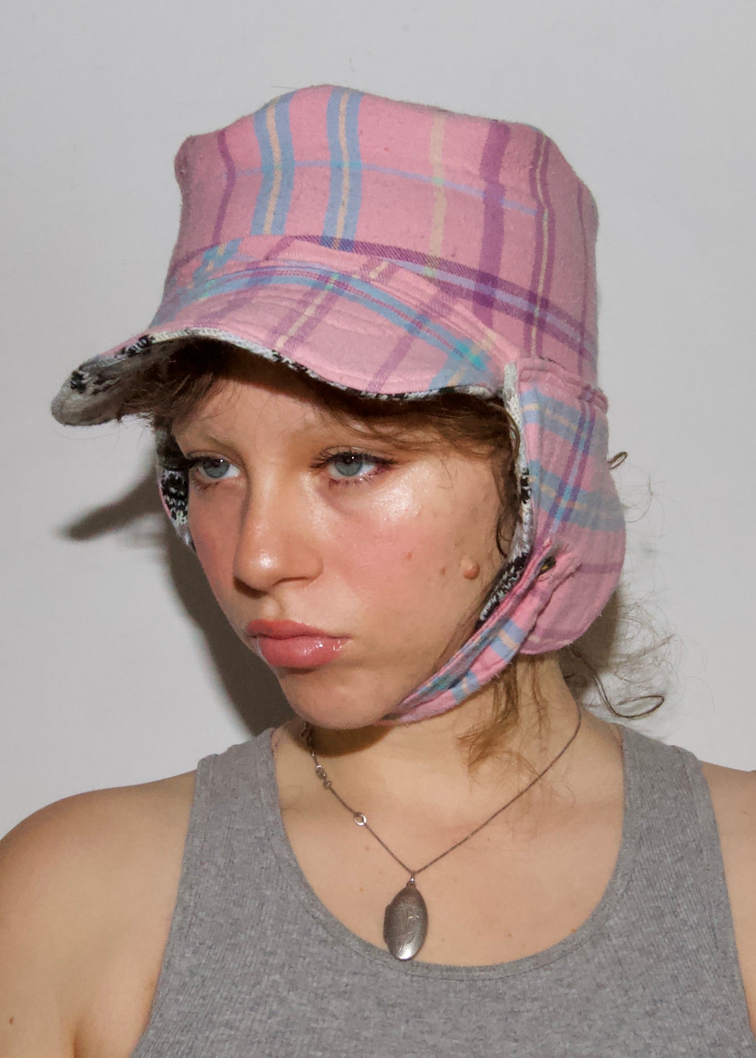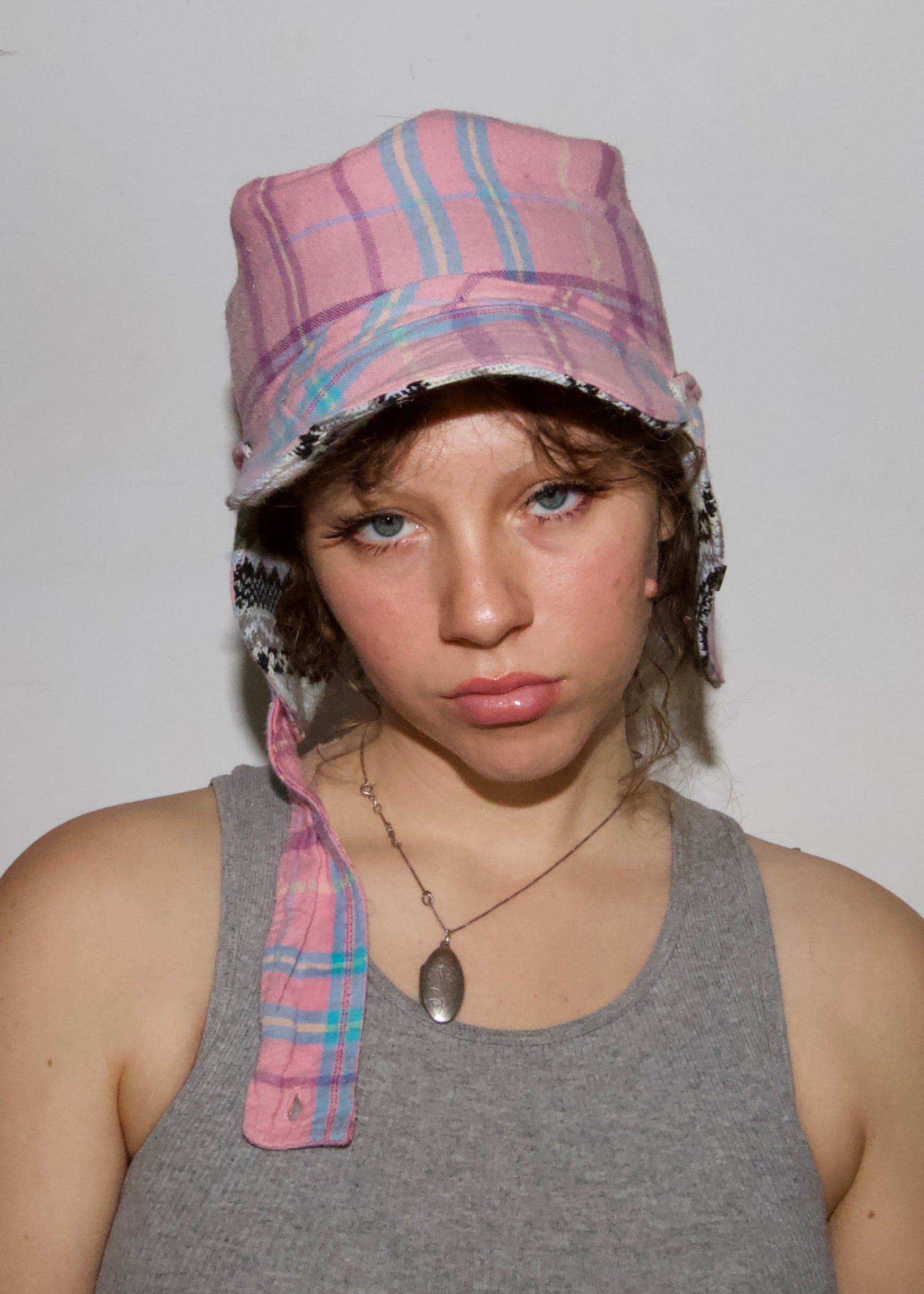 This pink flannel maskie-trapper-hat was made with a used button shirt. Lined with the remnants of a pre-loved winter blanket, this maskie hopes to keep the wearer’s head and heart warm throughout the winter seasons. It hopes to keep the wearer’s thoughts filtered through love, erasing any layers of resentment or shame or grief, allowing for the light of love to flow in. This maskie has high hopes for its wearer.